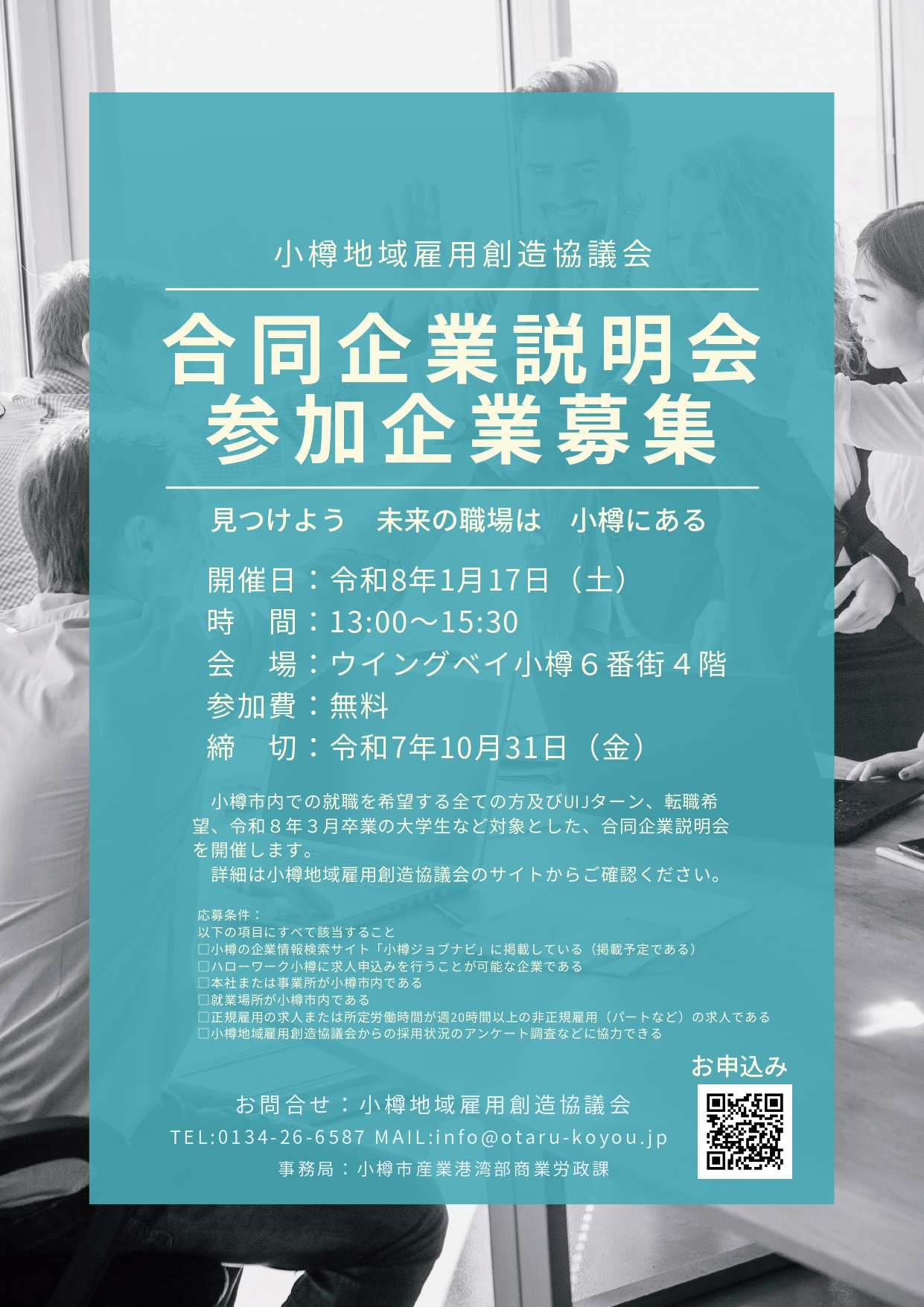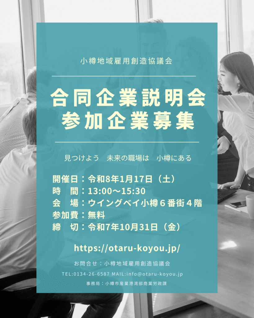 - 対象者:小樽市内での就職を希望する全ての方及びUIJターン、転職希望、令和8年3月卒業の大学生など