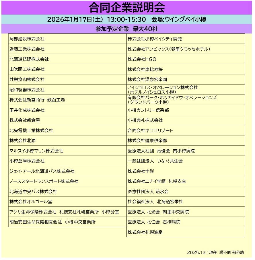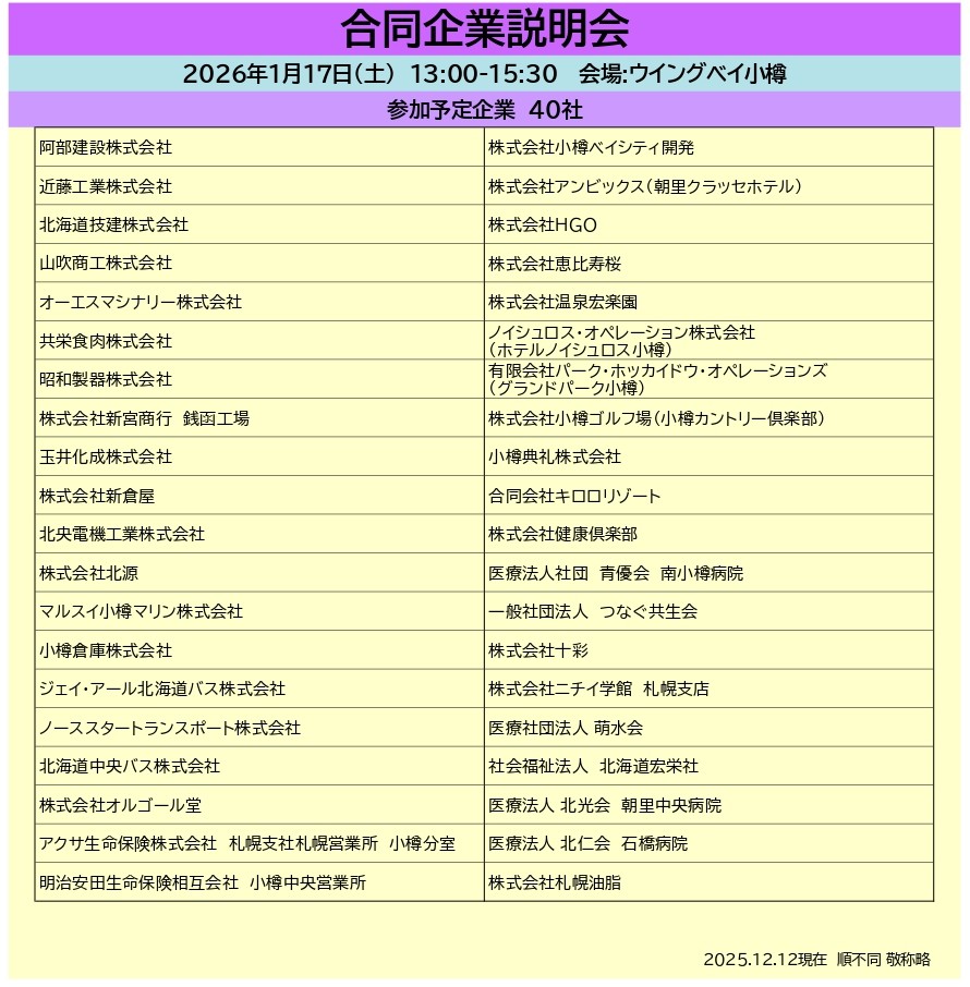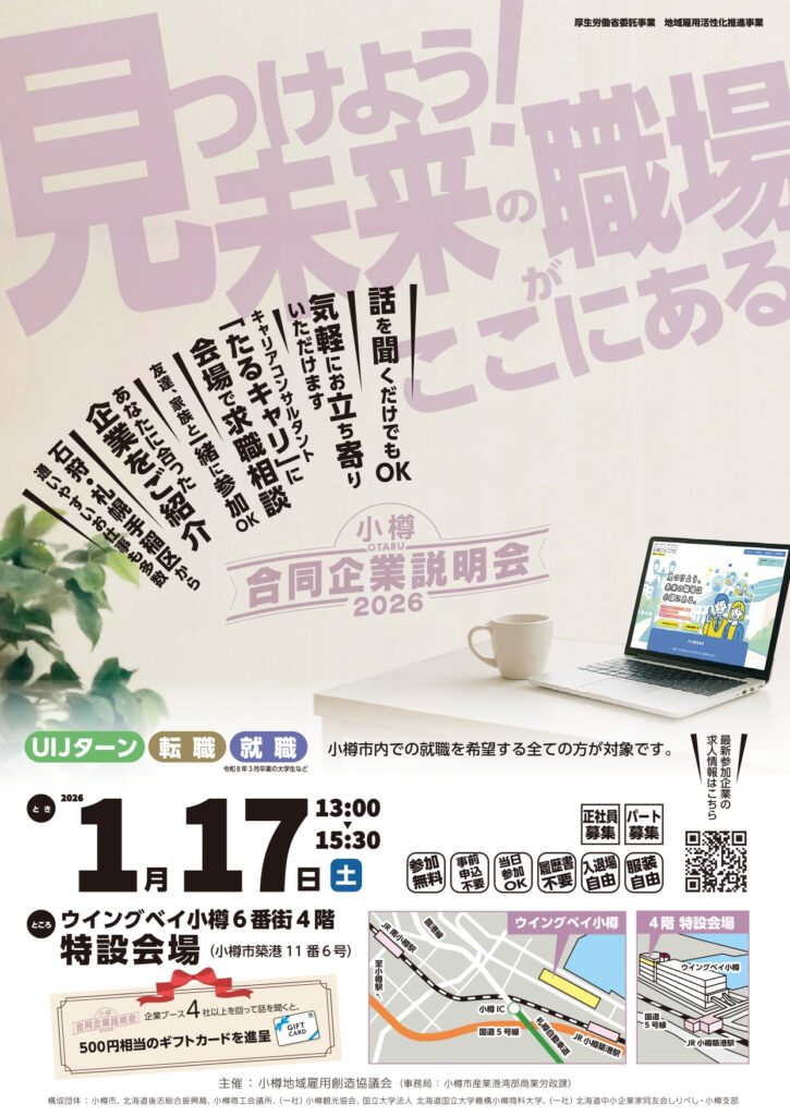 - 対象者:小樽市内での就職を希望する全ての方 及びUIJターン、転職希望、小樽の会社に興味がある学生など